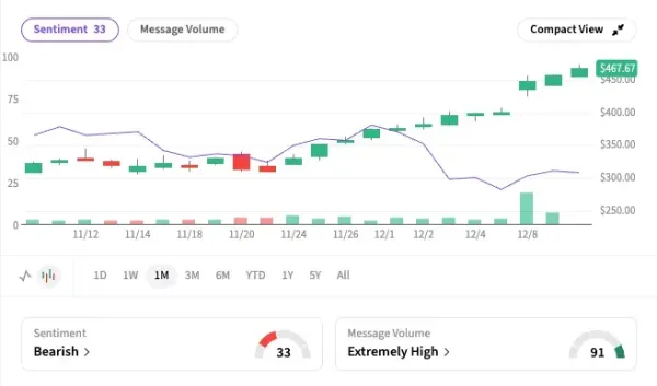 Notably, Stocktwits sentiment for CVNA dropped as the stock rallied this month and was ‘bearish’ as of the last reading.