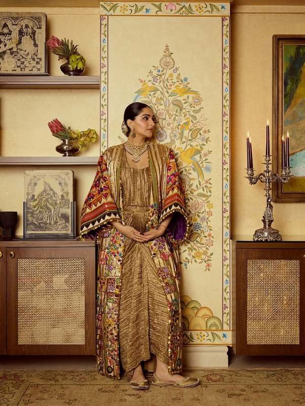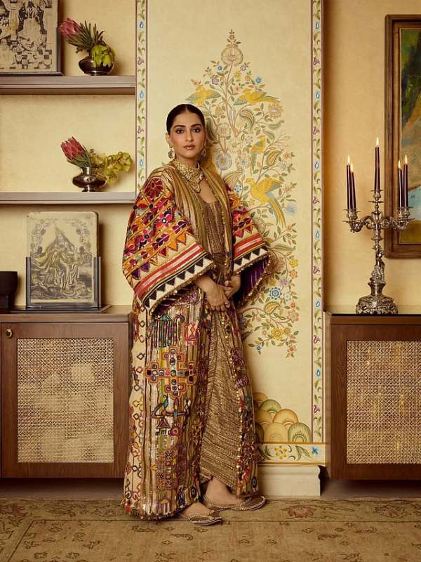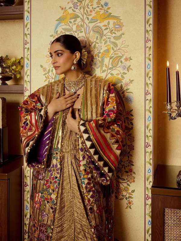 Underneath, Sonam opts for a gold pleated dress with a soft metallic sheen. The texture adds depth and movement, making the outfit feel fluid and elegant while highlighting her baby bump