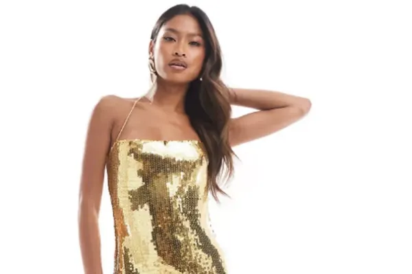 For more of a halterneck style that's slinky, the ASOS Design sheer sequin square neck midi dresswith cross strap detail in gold has been reduced from £50 to £35.
