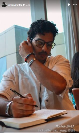 Taking to his Instagram handle, Ishaan offered a glimpse of his trip to the US. Along with a picture of himself, appearing engrossed in taking notes, the actor wrote, "Mumbai-LDN-LA. Back on the road...lessgo 2026!!"