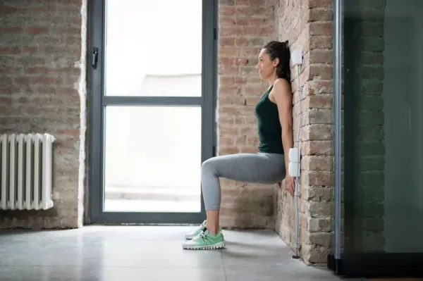 Wall Wall Squat: Stand with your back against a wall, place your feet about two feet out, shoulder-width apart. Keeping your back straight and core engaged, slide down until your knees form a 90-degree angle. Pause before pushing you weight in your heels and sliding back up.