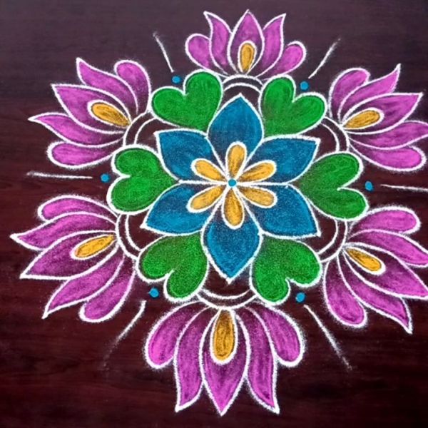 3. Floral Pongal kolam designFloral kolams are popular during festive occasions and reflect the beauty of spring and harvest. Simple flower patterns filled with vibrant colours create a lively look. Using fresh flower petals adds texture and fragrance, making the kolam more visually engaging.