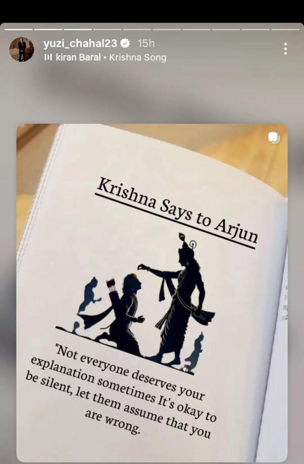 Yuzvendra Chahal drops cryptic post after unfollowing RJ MahvashYuzvendra Chahal took to his Instagram Stories to drop a picture of a page from a book. In it one can see a silhouette of Lord Krishna and Arjun, with the title " Krishna Says to Arjun ." Below the picture, it was written, "Not everyone deserves your explanation. Sometimes it’s okay to be silent; let them assume that you are wrong."