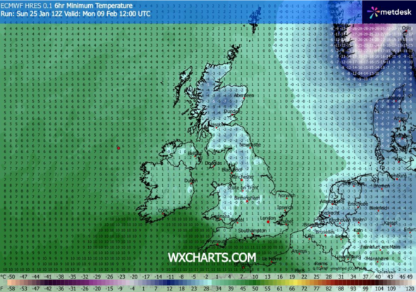 Maps from forecaster WXCHARTS show that on Monday, February 9, at 12 noon, freezing temperatures will sweep Britain. Lows of -7C will make their way to Scotland, with the coldest temperatures to be in Cairngorms National Park. In the north of England and down towards the midlands, temperatures will sit at around 0C to -2C. Around 95% of the country looks to be covered with snow.
