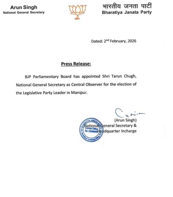New Delhi: The Bharatiya Janata Party (BJP) has taken the first steps towards forming a government in Manipur, appointing national general secretary Tarun Chugh as the central observer for the election of the state’s legislative party leader. The announcement signals the party’s intent to select a new Chief Minister ahead of the expiry of the current spell of President’s rule.