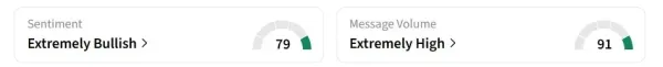 Retail sentiment on Stocktwits has remained in the ‘extremely bullish’ zone over the past 24 hours, amid ‘extremely high’ message volumes.