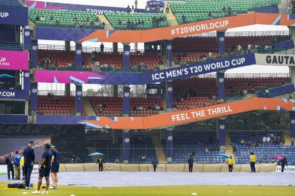 Groundsmen remove covers before the start of the ICC Men’s T20 World Cup 2026 cricket match between South Africa and UAE, at Arun Jaitley Stadium in New Delhi, Wednesday, Feb. 18, 2026. (Photo: PTI)