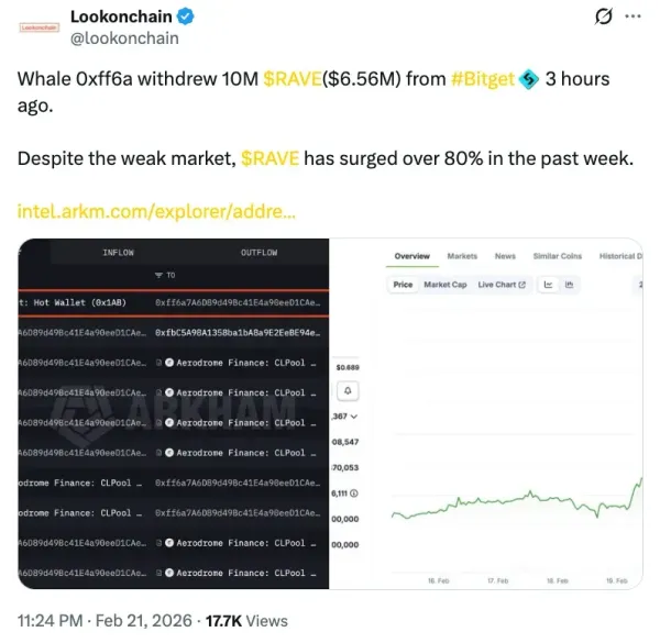 A wallet identified as 0xff6a withdrew 10 million RAVE, worth about $6.56 million, from crypto exchange Bitget on Saturday, as the token rose roughly over 84% over the past week.