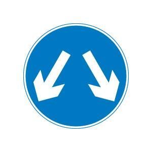 Motorists are being cautioned about a blue circular road sign featuring white arrows that frequently gets mixed up with other Highway Code instructions. The sign, displaying two white arrows pointing diagonally downwards in opposing directions, indicates vehicles may pass on either side of an obstruction up ahead.
