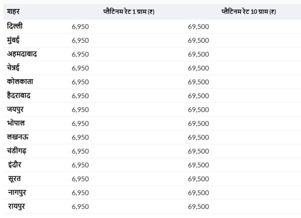 That means, the price of 10 grams of platinum is ₹ 69,500. Platinum prices remained almost the same in most cities across the country. The price of 1 gram platinum in Mumbai, Chennai, Ahmedabad, Kolkata, Jaipur, Bhopal and Indore is ₹ 6,680.
