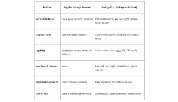 Savings Pro is a premium savings solution from Jio Payments Bank that offers both savings and growth potential. Unlike a standard savings account, Savings Pro automatically invests any surplus funds above a chosen threshold into low-risk overnight mutual funds. Some of the key features include: