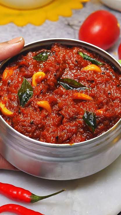 Lightly sour and slightly sweet – everyone likes it. First of all, fry and grind tomatoes, garlic, green chillies and spices. You can eat it with roti, rice or pakodas.