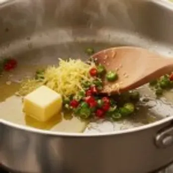 Melt butter in a large saucepan. When it melts, add chopped green chillies, red chillies and grated ginger and fry well, until a nice aroma starts coming from them.