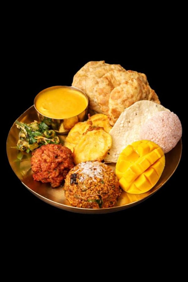 The thali includes Aamras, Puri, Papad, Pyaz Pakoda, Masala Bhaat, Aloo Bhaji, and a fresh slice of mango, creating a spread where every bite shifts the experience. A little heat, a little salt, something warm, something crisp, and then the mango returns, soft, sweet, and familiar, bringing everything back into balance.
