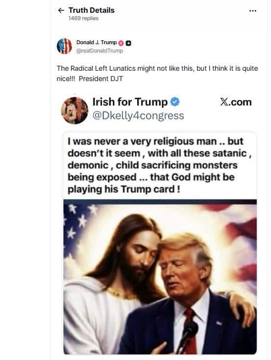 Donald Trump has sparked fresh controversy after sharing a post featuring an image of himself alongside a figure resembling Jesus Christ, reigniting debate over religion in US politics. The viral post, originally shared by a supporter, suggests divine backing for Trump and was endorsed by him with the remark that he finds it “quite nice”. The development has triggered sharp reactions online, with critics accusing him of promoting religious imagery for political messaging, while supporters frame it as symbolic faith-based expression.