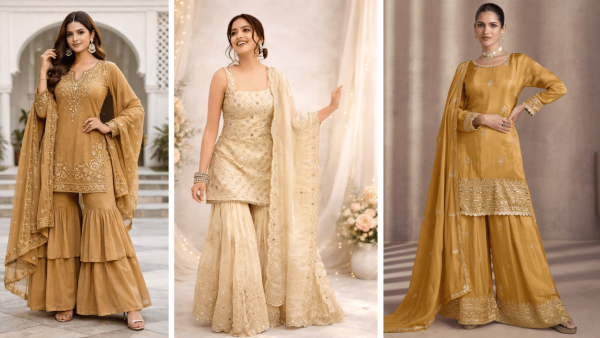 Gold embodies riches, divine favour, and endless wealth, perfectly matching the gold-buying traditions of Akshaya Tritiya. It radiates luxury and invites opulence. Slip into a shimmering gold sharara set with cape-style shrug, paired with statement necklace and mojaris for an elegant puja or family gathering vibe.