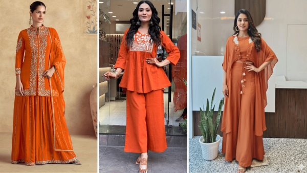 Orange and saffron evoke the sun, spirituality, and selfless service, enhancing devotion during community pujas and charitable acts. They spark inner joy. Pick an energetic saffron co-ord set with wide-leg pants and fringe jacket, completed with rudraksha mala and espadrilles for a spirited, prayerful look.