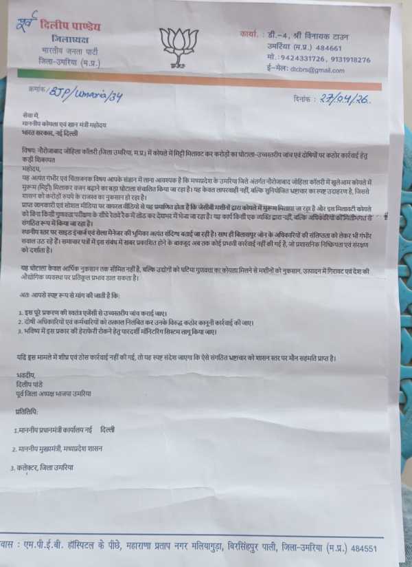 South Eastern Coalfields Limited (SECL) Naurojabad Johila Colliery of Umaria district is once again in the headlines due to serious allegations. This time the matter is not of ordinary irregularity, but of increasing the weight by mixing mud in coal and an alleged scam worth crores of rupees. Regarding this entire matter, the former district president of BJP has sent a complaint directly to the Coal and Mines Minister of the Government of India and demanded a high-level investigation.