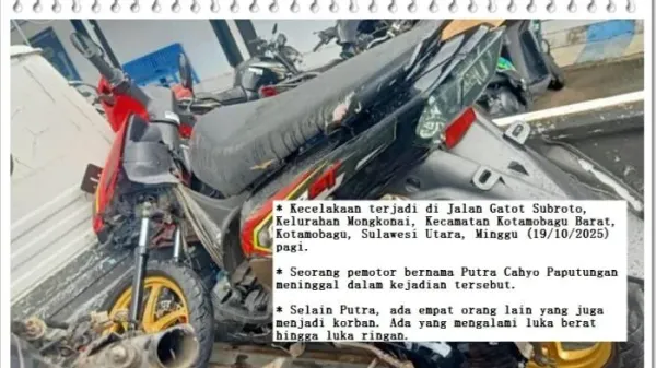 TRIBUNMANADO.CO.ID - Kecelakaan maut yang terjadi di Jalan Gatot Subroto, Kelurahan Mongkonai, Kecamatan Kotamobagu Barat, Kotamobagu, Sulawesi Utara, Minggu (19/10/2025) pagi, mengakibatkan seorang pemotor tewas.