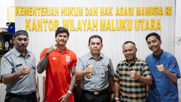 Melalui potret yang beredar, terlihat Ciro Alves yang memakai jersey berkerah berlogo Malut United berfoto bersama di Kementerian Hukum dan HAM Kantor Wilayah Maluku Utara.