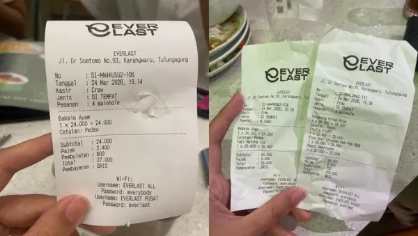 Peristiwa ini bermula dari unggahan pengguna X dengan akun @cinnamo0ns (24/03/2026), yang membagikan foto struk dari Everlast Eatery and Coffee.