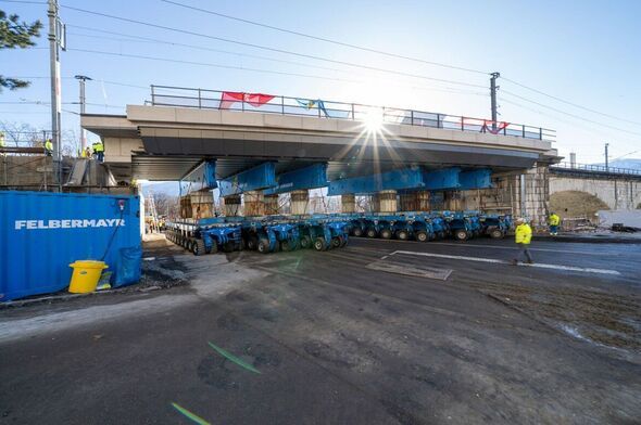 In total, 12 units were used, carrying 56 axles and 112 wheels. They moved at around 1-2 km/h, giving precise control as the bridge rolled into position over Hallerstraße.