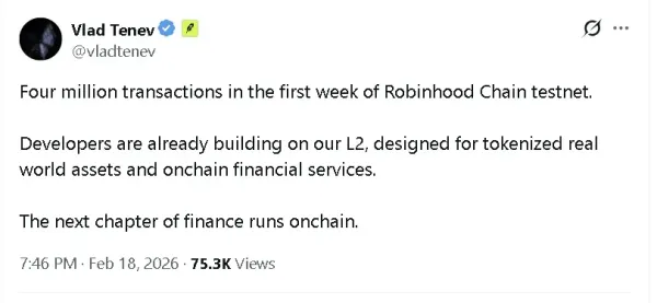 Robinhood (HOOD) CEO Vlad Tenev said Thursday that the company’s Robinhood Chain testnet processed four million transactions in its first week, signaling early developer activity around its blockchain push.