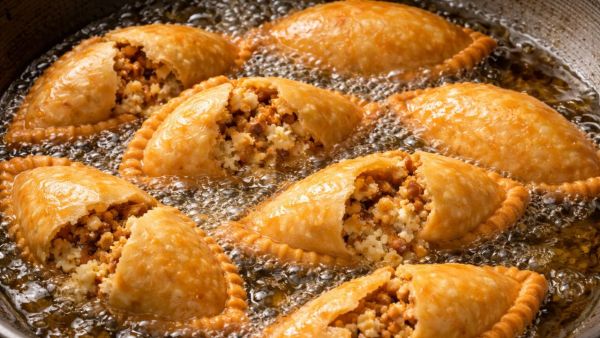 By putting Gujiya in very hot oil, the outer layer becomes hard immediately and due to steam formation inside, it may burst. On the other hand, if Gujiya is put in cold oil, it absorbs more oil and may break. Place lightly hot oil on medium flame and fry on low flame till it turns golden.