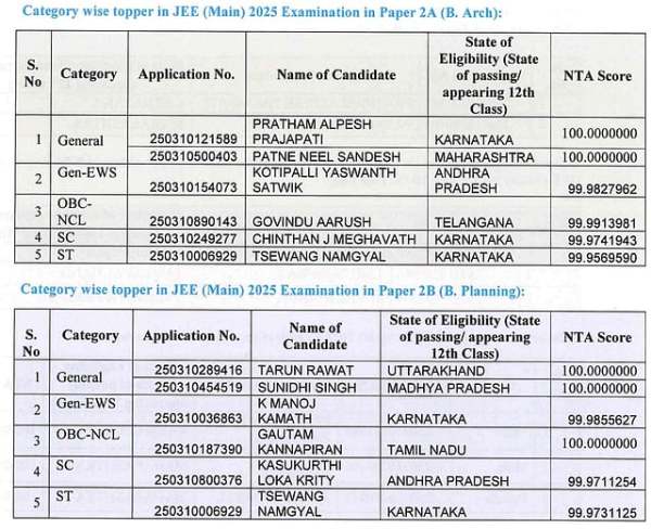 JEE Main Exam 2025: Paper 2A (B.Arch)gender-wise toppers