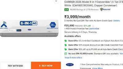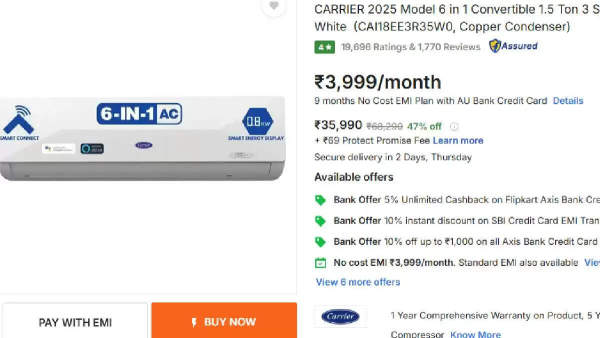 The Carrier 6-in-1 model is another excellent choice for those seeking a versatile cooling solution for their homes. It features a PM 2.5 HD filter to enhance air quality. This air conditioner has been tested to perform optimally even at temperatures as high as 52 degrees Celsius. It operates efficiently, consuming as little as 0.8KW of electricity, making it an energy-saving option. The 2-ton variant is currently available on Flipkart for Rs 57,990.
