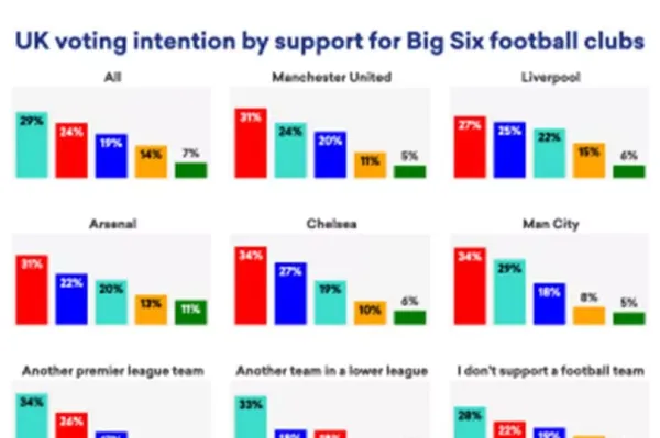 Other Premier League fansOf the fans of other clubs in the Premier League, over a third (34%) are planning to vote for Reform UK. Some 24% are intending to vote Labour, 13% Tory, 12% Lib Dem and 6% Greens.