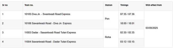 In latest update, an experimental stoppage for select trains at Pen and Roha stations has been announced. Trains include the Diva Jn. - Sawantwadi Road Express at Pen and the Dadar - Sawantwadi Road Tutari Express at Roha, with specific timings. This initiative starts from 3 September 2025. Passengers are encouraged to use these services. For more details, visit www.enquiry.indianrail.gov.in.
