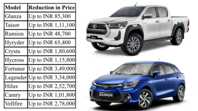The Toyota Glanza sees its tax rate drop from 29% to 18%, translating to benefits of up to Rs 85,300, while the Toyota Taisor also moves from 29% to 18%, with savings of up to Rs 1.11 lakh. The Toyota Rumion’s rate falls from 45% to 40%, offering up to Rs 48,700 in benefits, and the Toyota Hyryder gets a similar cut, resulting in up to Rs 65,400 in savings.