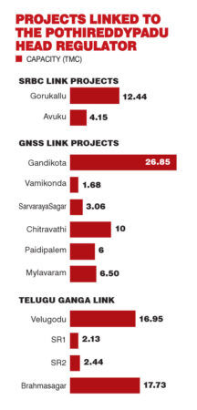 It is the second ambitious lift irrigation initiative aimed at supplying irrigation water to the Rayalaseema region by diverting ‘surplus’ water from the Srisailam reservoir to irrigate farm lands across Kurnool, Anantapur, Kadapa, and Chittoor districts. The canal spans about 565 km and has about 12 lifts, pumping water to a height of about 370 metres. The project is supported by 43 pump houses and 269 pump-motor units.