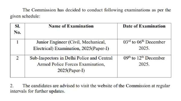 The Staff Selection Commission (SSC) has announced the exam schedule for Junior Engineer (JE) and Delhi Police SI (SSC CPO) Recruitment Paper 1. The SSC has shared the exam dates in a notification on the official website, ssc.gov.in. Candidates can keep these dates in mind and continue their exam preparations.