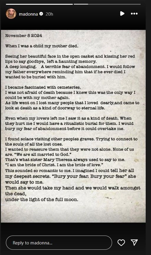 "When I was a child my mother died," wrote Madonna. "Seeing her beautiful face in the open casket and kissing her red lips to say goodbye, left a haunting memory. A deep longing. A terrible fear of abandonment. I would follow my father everywhere reminding him that if he ever died I wanted to be buried with him," reported People.