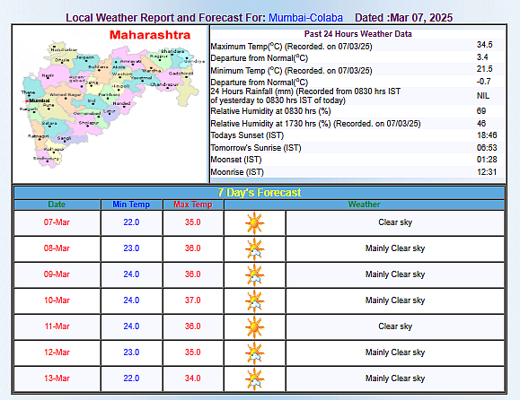 On March 7, Mumbai city will experience prominently clear skies according to a weather report by the weather department. The temperatures would vary from the low of 24 degrees Celsius to 36 degrees Celsius on Sunday.