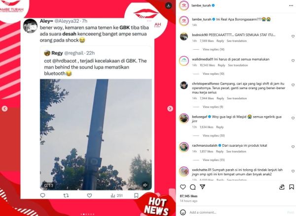 Adapun kejadian itu bermula dari cuitan beberapa netizen di Twitter yang diunggah ulang oleh akun @lambe_turah. Dalam unggahan itu, tampak beberap netizen merekam suara toa GBK yang terdengar suara desahan wanita.