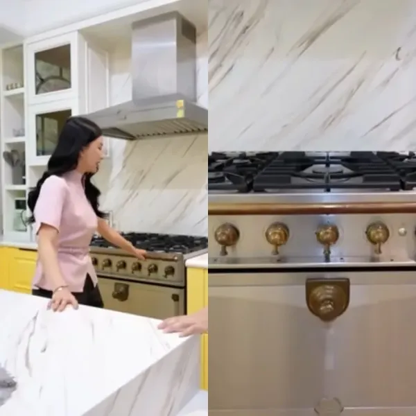 Dapur tempat ia masak sehari-hari pun punya area lebih luas daripada dapur syuting. Didominasi dengan meja dan tembok marmer berwarna putih, serta ada sentuhan warna kuning cerah di beberapa area.