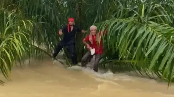 SERAMBINEWS.COM, SINGKIL - Bupati Aceh Singkil, Safriadi Oyon berhasil selamatkan warga yang terjebak banjir di pohon sawit.