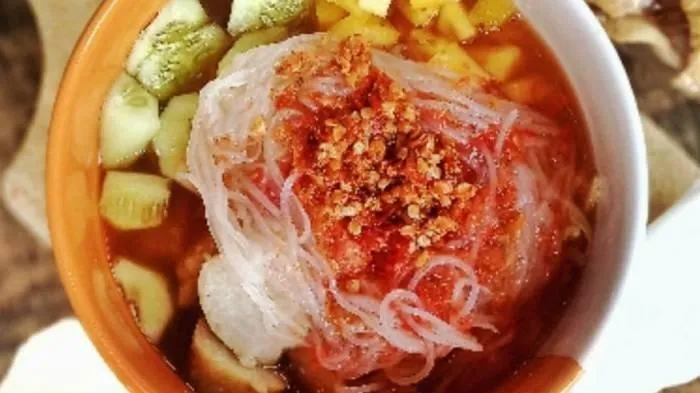 Bumbu rujak yang diulek dengan cabai rawit pedas bertemu dengan siraman kuah pindang yang memiliki cita rasa gurih laut yang pekat.