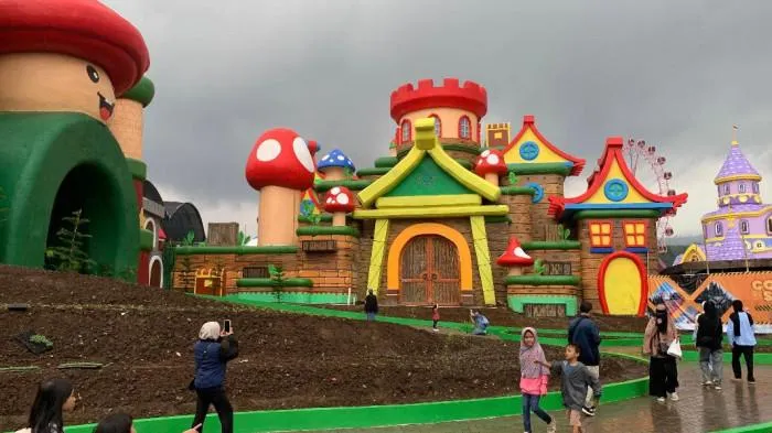 Taman rekreasi keluarga bertema jamur warnawarni dengan latar belakang Gunung Arjuno itu kini memasuki masa uji coba kunjungan.