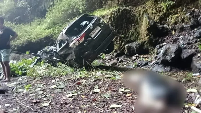 Kasi Humas Polres Karangasem, IPDA I Nengah Artono menjelaskan, kecelakaan diduga terjadi karena pengemudi kehilangan kendali saat melintas di jalan menikung yang berada di tepi jurang.