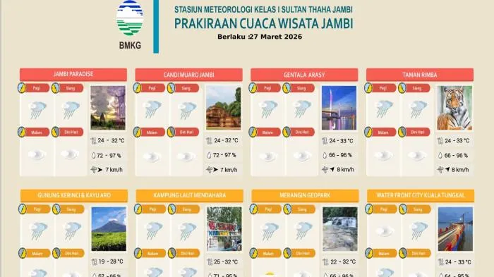 TRIBUNJAMBI.COM - BMKG Jambi merilis prakiraan cuaca di sejumlah destinasi wisata di Provinsi Jambi untuk Jumat, 27 Maret 2026.