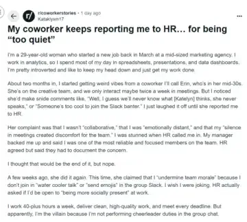 HR steps in after complaints about her silence:In her post, she mentions that Erin regularly commented about her silence during meetings and lack of participation in team chats.
