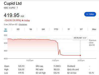 Mumbai: Shares of Tourism Finance Corporation of India Ltd. (TFCI) and Cupid Ltd. plunged sharply on Friday, January 2, hitting the 20 percent lower circuit. TFCI stock, which had been on a two-day winning streak and was up over 3 percent during the day’s high, saw its gains wiped out in a sudden drop. Cupid, too, broke its 13-day winning streak in today’s session, locking in a 20 percent decline.