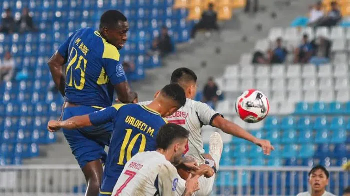 Lucas Frigeri yang sudah melompat gagal mengamankan bola yang melaju dengan kencang.