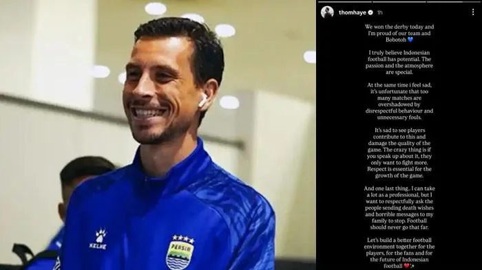 "Kami menang derby hari ini dan saya bangga dengan tim kami dan bobotoh. Saya benar-benar percaya sepak bola Indonesia punya potensi. Antusiasme dan atmosfernya sangat lah istimewa," tulis Thom Haye lewat Instagram resminya yang tayang pada Minggu (11/1/2026).