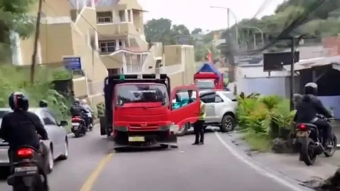 Akibatnya, kendaraan besar tersebut kehilangan kendali dan meluncur mundur ke arah kendaraan di belakangnya.