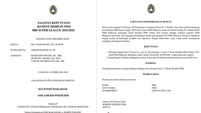 “Klub PSM Makassar dikenakan sanksi denda sebesar Rp 60.000.000.-(enam puluh juta rupiah),” demikian yang tertulis di salinan yang diperoleh Tribun-Timur.com, Kamis (5/2/2026).